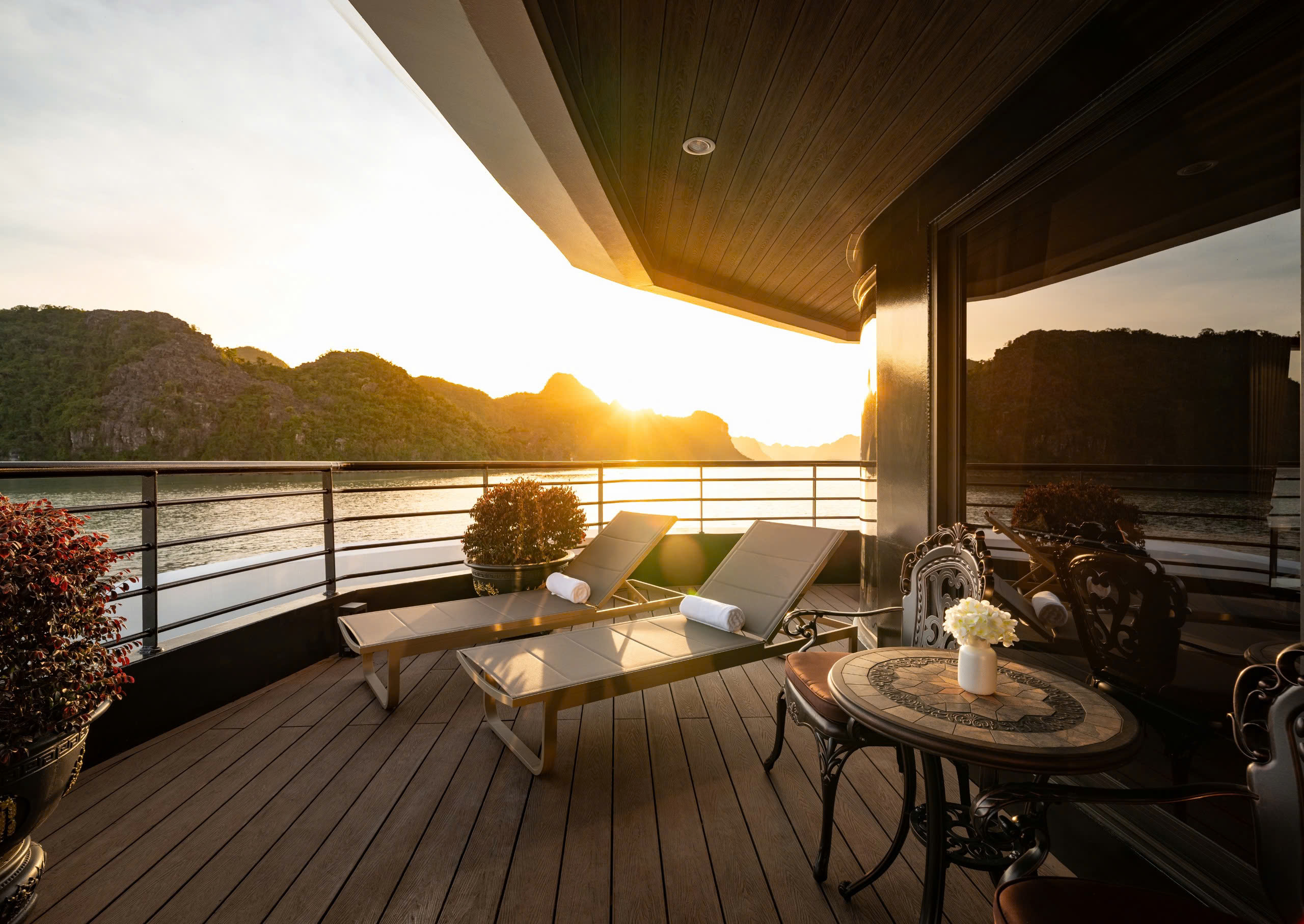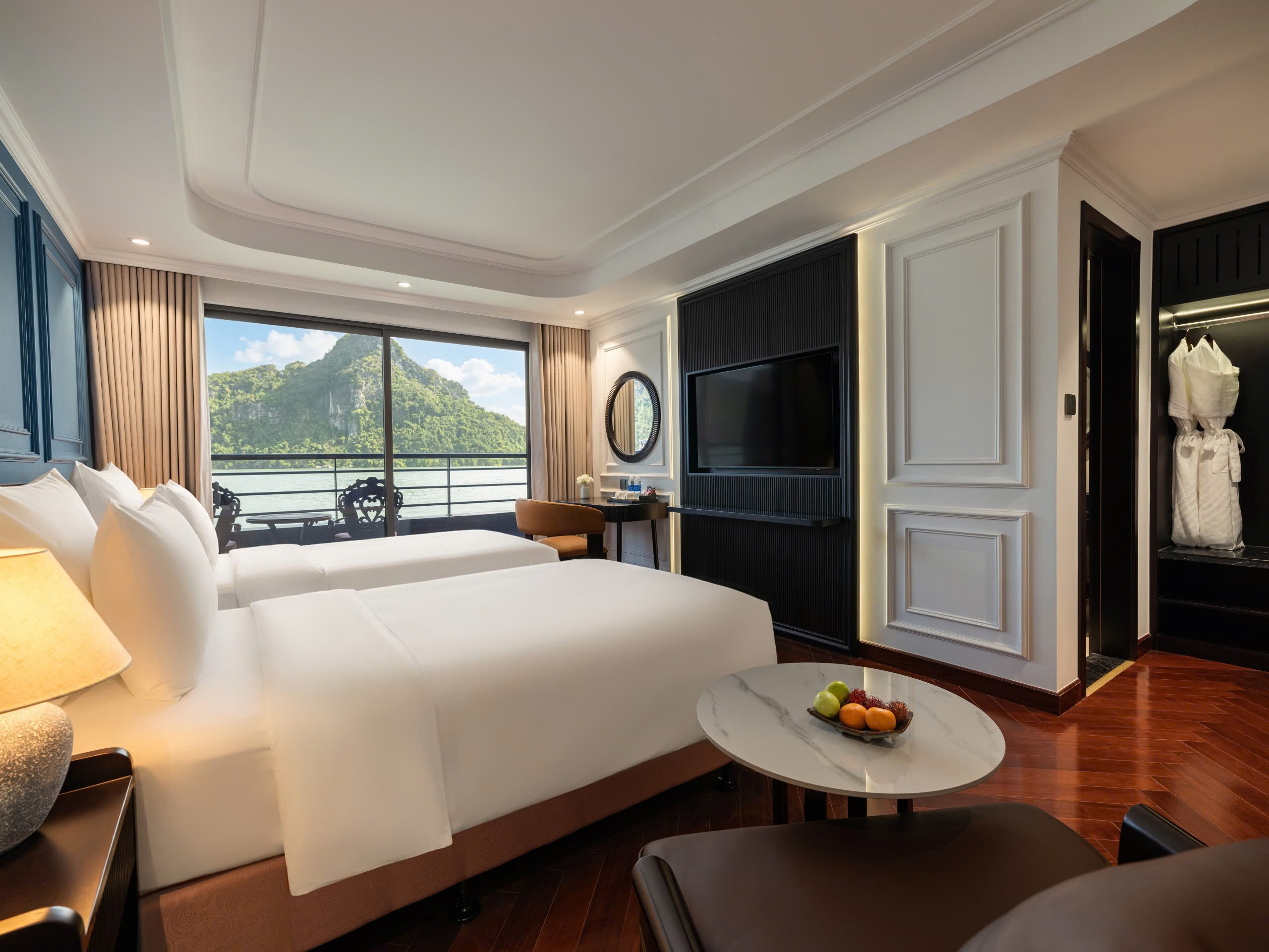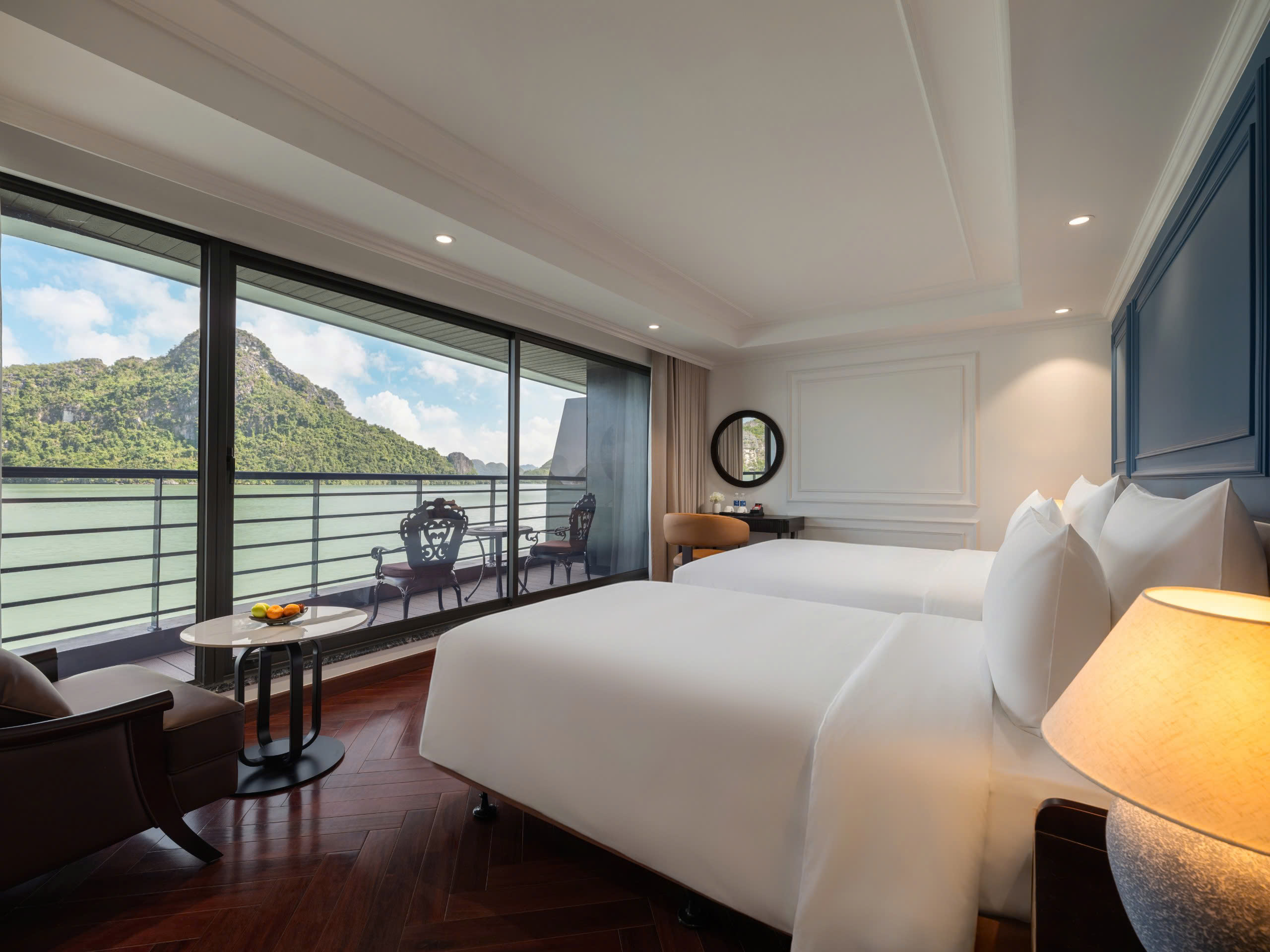 100% phòng nghỉ có ban công riêng kính tràn, cho phép du khách chiêm ngưỡng trọn vẹn vẻ đẹp hoang sơ, yên bình của vịnh Lan Hạ ngay từ phòng ngủ.